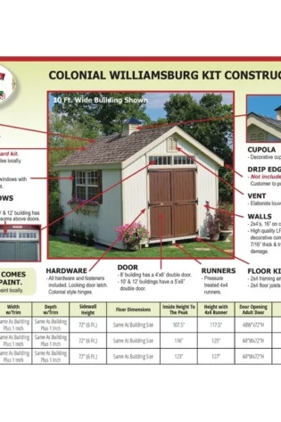 Colonial Williamsburg 10′ wide x 16′ deep solid and faux wood storage shed