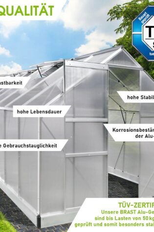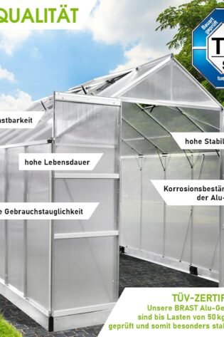 BRAST Aluminium Greenhouse with Base 490 x 250 x 205 cm, TV Tested, 6 mm Hollow Chamber Panels, Rustproof/Weatherproof/Temperature-Resistant