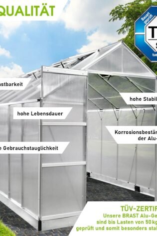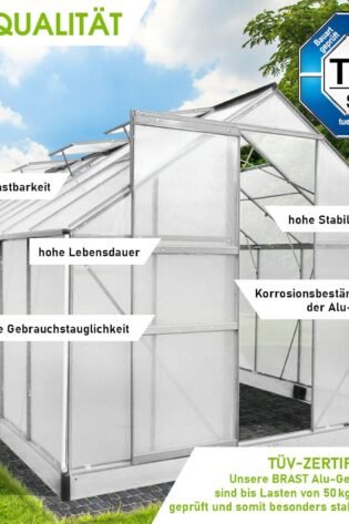 BRAST Aluminium Greenhouse with Base 490 x 250 x 235 cm, TV Tested, 6 mm Hollow Chamber Panels, Rustproof/Weatherproof/Temperature-Resistant