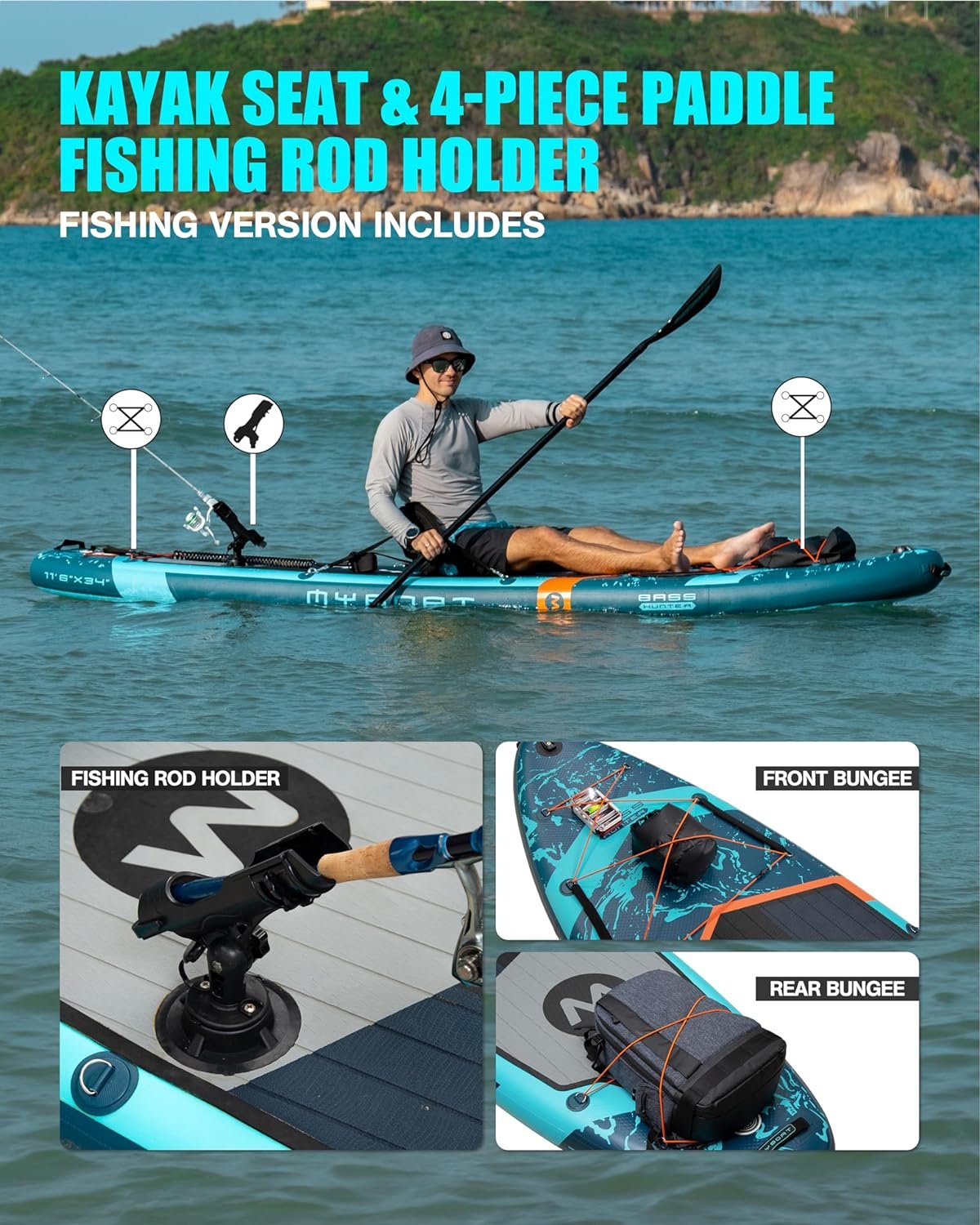 ??COMPLETE PADDLEBOARD KIT & 24H SERVICE??All professional accessories: Fishing rod holder. kayak seat. safety leash. hand pump. 3 removable fins. length-adjustable strong paddle. mobile phone waterproof bag. 5L waterproof backpack. Stand up inflatable board is perfect for professional athletes. sea sports enthusiasts. beginners. elder players. and youth. MYBOAT offers 1 year warranty for your order. if any questions. please feel free to contact us!