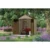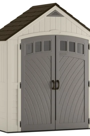 - Classic shed design with architectural details and metal-reinforced shingle-style roof panels