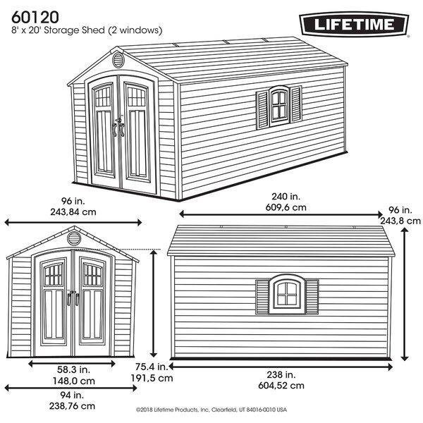 The Lifetime 7 ft. 8 in. W x 19 ft. 8 in. D Plastic Storage Shed features:(2) windows. (2) sets of shutters. (1) full-length ridge skylight. (1) 90″ shelf. (4) corner shelves. and (1) set of two peg strips. It comes in (4) boxes. Lifetime’s 8-foot wide Outdoor Storage Sheds are the perfect solution to your storage needs. Built with durable. dual-wall high-density polyethylene. our sheds are steel-reinforced and low-maintenance. With various features including shatter proof windows. skylights. custom shelving. and much more. a Lifetime Shed is a perfect addition to your backyard.