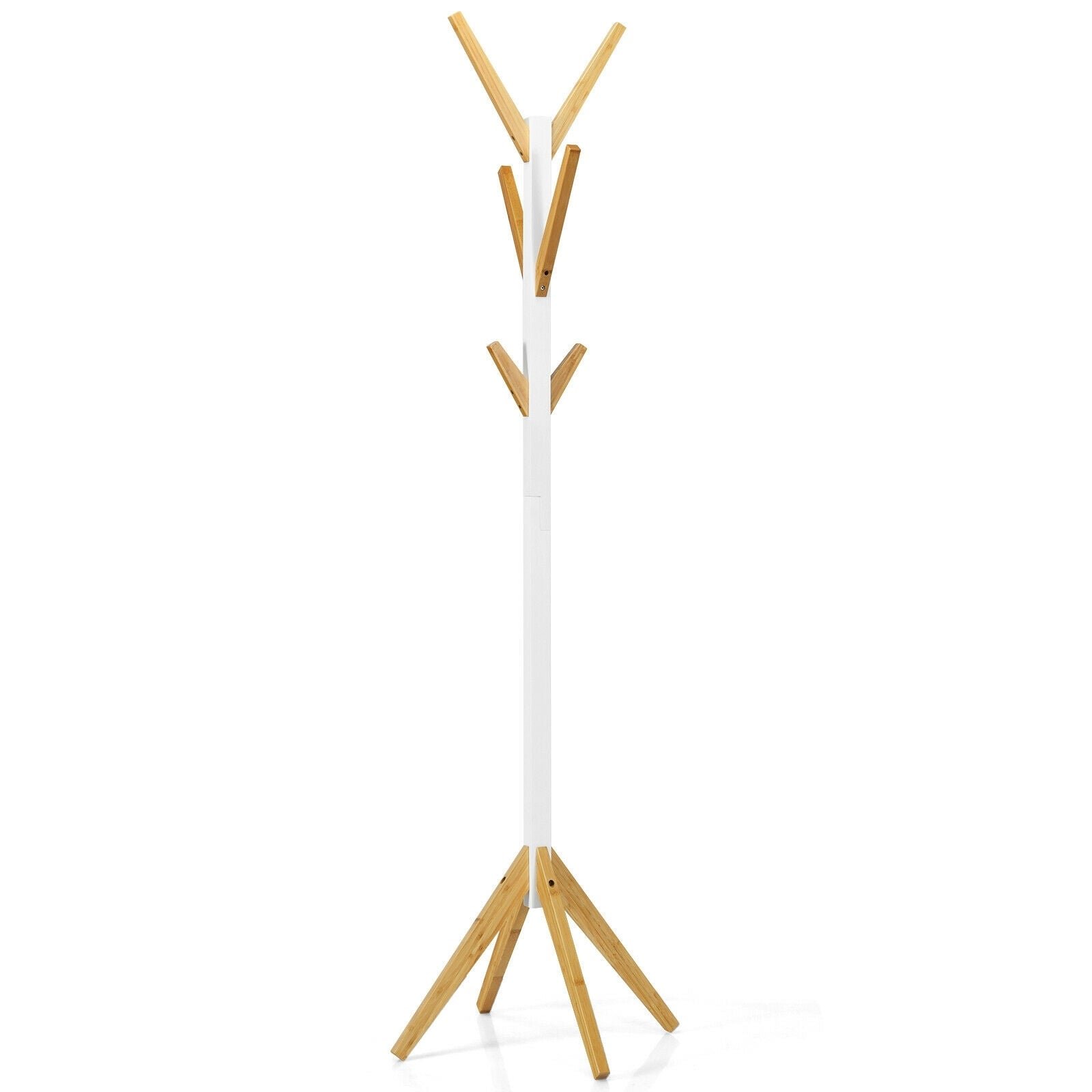It is designed with a narrow and long shape that requires little room for standing. Yet 6 hooks with reasonable gaps and length add ample hanging capacity for clothing and accessories without any wobbling. Painted with white and natural finishing this freestanding coat hanger is elegant and suitable for many rooms such as foyers living rooms office workspace and more. The pure bamboo structure has 4-claw legs for optimized stability and durability. It is easy to assemble with illustrated manual with each hook fixed individually.