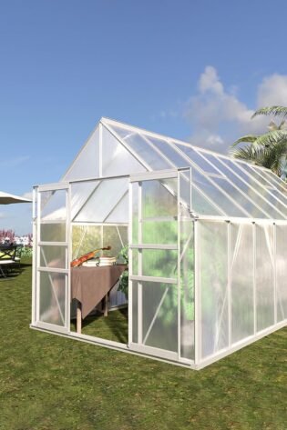 - Convincing equipment for first-class greenhouses: Our greenhouses pleasantly stand out thanks to the included base frame. robust 6 mm hollow chamber panels. solid corner connectors. height-adjustable and closable ventilation windows. smooth sliding door on wheels. practical plant hanger hooks and the 2 rain gutters with 4 downpipes.
