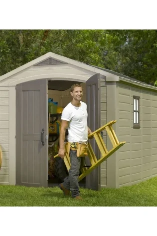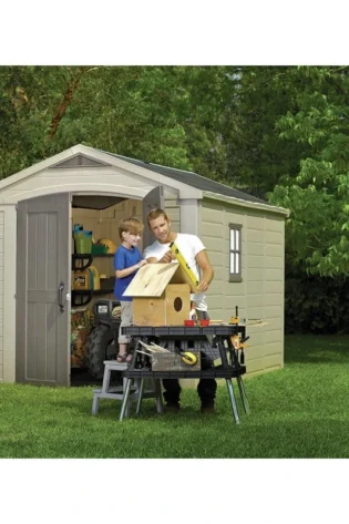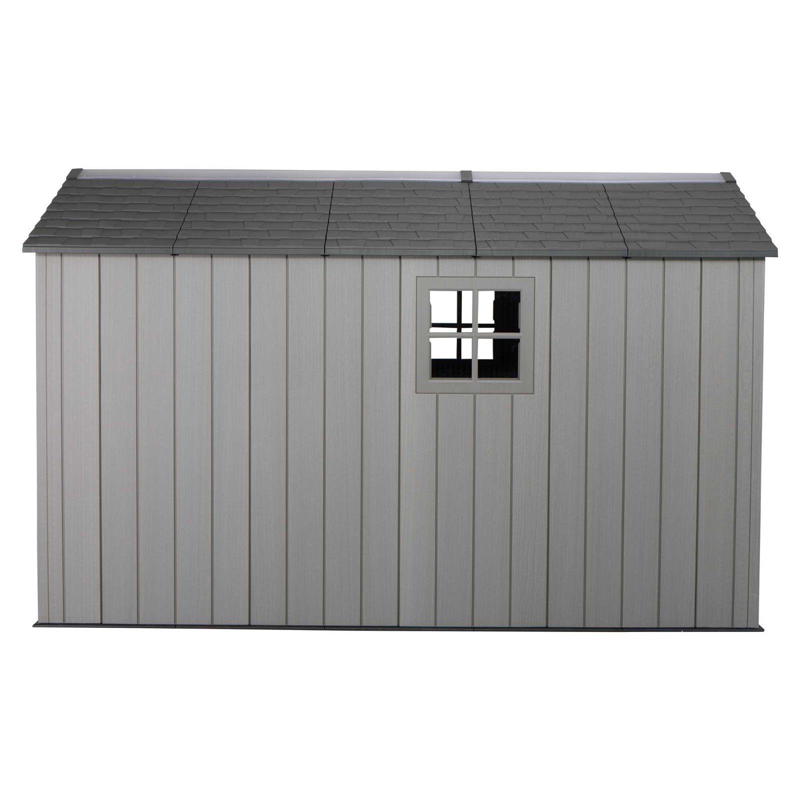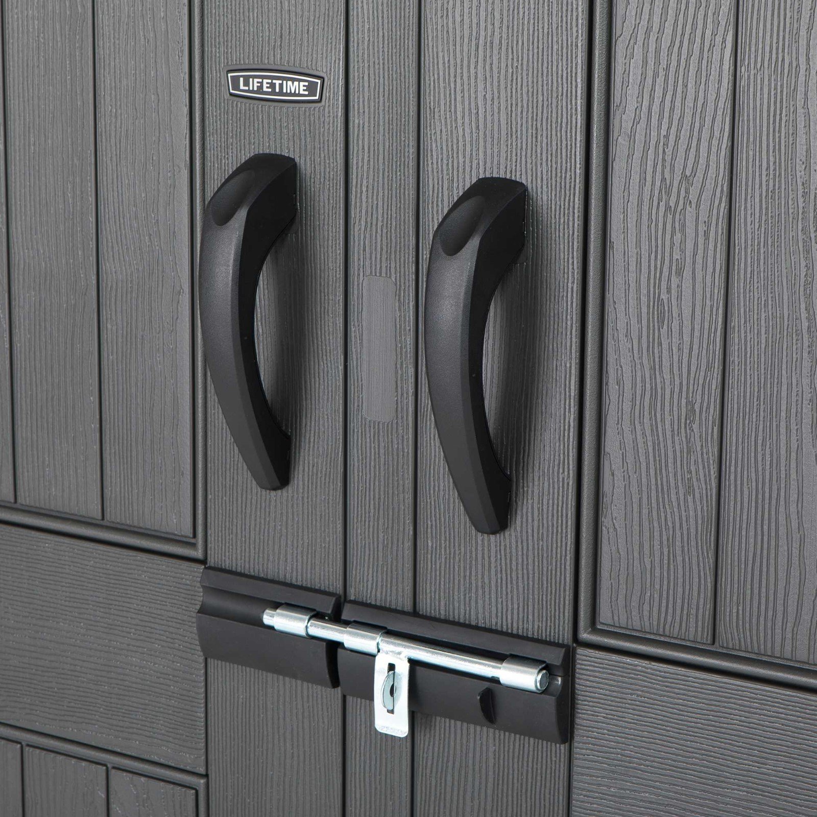 Organize your yard. store your outdoor supplies and furniture. and stow your lawn and garden equipment more easily than ever before with the Lifetime Metal Reinforced Outdoor Storage Shed. Set up your space how you want it with height-adjustable shelving and enjoy the low maintenance of a UV-protected finish that protects against damage from weather and the elements. A full-length ridge skylight provides rich natural interior lighting and the high-pitched roof allows for quick drainage of rain and snow. The shed is made of steel-reinforced high-density polyethylene and a sturdy double wall system for maximum durability and longevity. and heavy-duty steel trusses provide exceptional roof strength. Work in confidence on the slip-resistant floor that protects against oil. solvents. and stains. and is easy to clean just like the rest of the shed. You can also protect your gear behind lockable steel-reinforced doors. With an attractive design and appearance. as well as unique Rough Cut texture that has the natural look and feel of wood without the maintenance of staining or painting. you can enjoy not just the convenience and utility of your shed but also preserve the beauty of your yard. Whether you’re looking to store some equipment or organize all of your tools. the Lifetime Outdoor Storage Shed has the features to make it feel easy and look great.