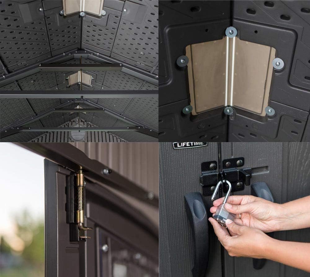 Lifetime’s 8-foot wide outdoor storage sheds are the perfect solution to your storage needs. Built with durable. dual-wall high-density polyethylene. our sheds are steel-reinforced and low-maintenance. With various features including shatter proof windows. skylights. custom shelving. and much more. a Lifetime Shed is the perfect addition to your backyard.