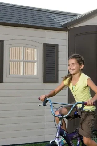 Upgrade your outdoor storage and organization with the Suncast Modernist Storage Shed.Multi-layer resin construction is durable and easy to maintain.The shed design includes 4 large transom windows to provide natural light to the interior and functional vents for air circulation.It also has a reinforced floor that can accommodate heavier items. and the roof can withstand snow loads of up to 40 pounds.The metal handle also comes with a padlock for added security (lock not included).Assembly is easy and requires minimal tools.<font style=”–tw-border-spacing-x: 0; –tw-border-spacing-y: 0; –tw-translate-x: 0; –tw-translate-y: 0; –tw-rotate: 0; –tw-skew-x: 0; –tw-skew-y: 0; –tw-scale-x: 1; –tw-scale-y: 1; –tw-scroll-snap-strictness: proximity; –tw-ring-offset-width: 0px; –tw-ring-offset-olor: #fff; –tw-ring-color: rgb(59 130 246 / 0.5); –tw-ring-offset-shadow: 0 0 #0000; –tw-ring-shadow: 0 0 #0000; –tw-shadow: 0 0 #0000; –tw-shadow-colored: 0 0 #